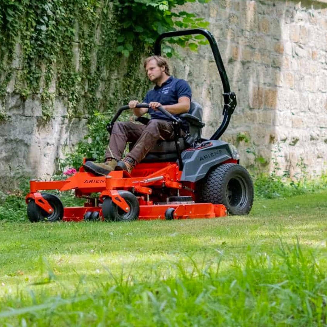 The ZENITH E 48R is the first professional electric zero-turn mower with interchangeable batteries. Designed to mow medium to large lawns for a whole day. The “R” on the ZENITH E 48R stands for “rear-discharge”. Advantage: The clippings are not thrown onto paths or into flower beds. The mown grass is discharged to the rear, between the wheels. Adjustable comfort seat for maximum driving comfort. With a cutting width of 122 cm, it is particularly manoeuvrable between narrow obstacles and on contoured, undulating surfaces. Professional warranty included.